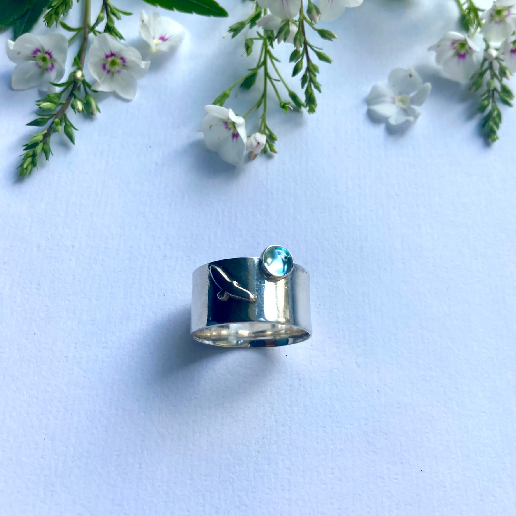 his Wide Band Ring features a bird in flight silhouetted against a silver sky. With an accent stone of Sky Blue Topaz, this ring is the perfect choice for a December Birthday (Blue Topaz is December's Birthstone).